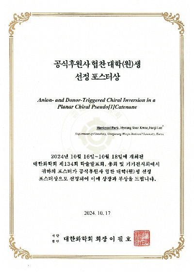 이번 학술발표회에서 박한결 석사과정생은 음이온과 주개 원자에 의해 유도된 평면 키랄성을 가진 유사[1]카테네인의 카이랄 반전 (Anion- and Donor-Triggered Chiral Inversion in a Planar Chiral Pseudo[1]Catenane)’라는 주제로 발표했다. 해당 연구는 특정 금속이온이 음이온과 유사[1]카테네인 구조를 갖는 거대고리 주개 원자의 차이에 의해 평면 카이랄성을 제어하고 반전시키는 원리를 규명하였다. 이는 분자 센서, 스위치형 분자, 선택적 촉매 등으로의 응용 가능성이 높다.