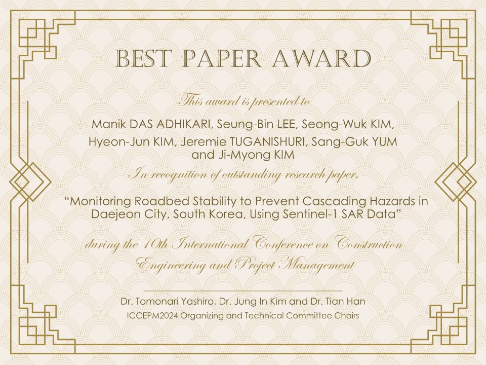건설관리 관련 총 250여편의 논문이 접수된 가운데, “Monitoring Roadbed Stability to Prevent Cascading Hazards in Daejeon City, South Korea, Using Sentinel-1 SAR Data”를 주제로 구두 발표한 염상국 교수팀의 논문이 최우수논문으로 선정되었다.