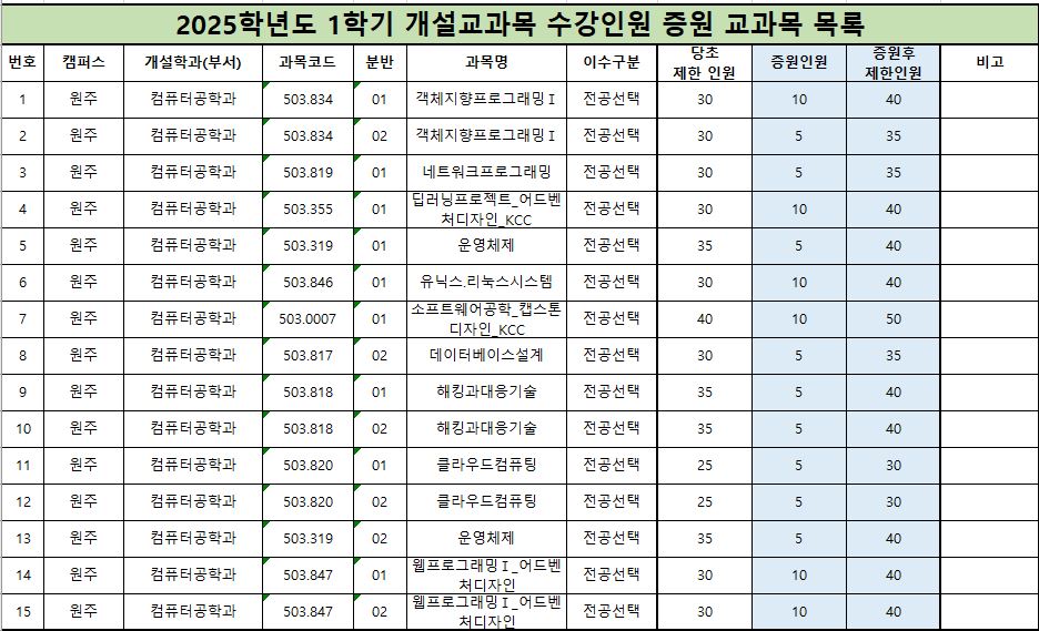 2025학년도 1학기 전공교과목 수강신청 인원 증원 안내