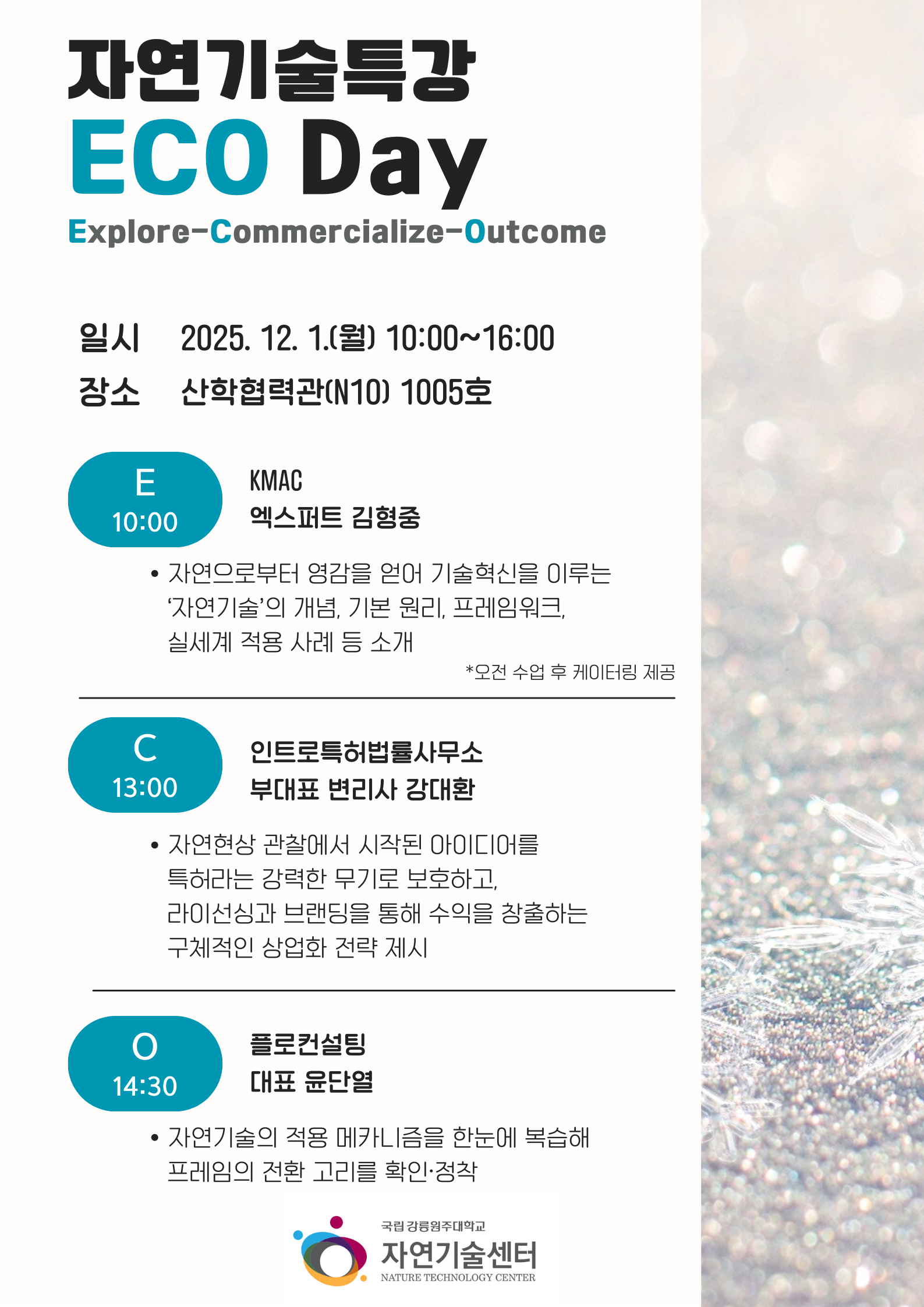 자연기술센터에서는 한 해를 마무리하는 12월의 첫날자연기술특강 ECO Day를 준비하고 있습니다. ECO Day는 제목인 ExploreCommercializeOutcome 그대로자연에서 얻은 아이디어를 탐색하고(Explore), 이를 기술과 비즈니스 모델로 구체화하며(Commercialize), 궁극적으로 사회적 산업적 성과로 이어지는 흐름(Outcome)을 함께 살펴보는 자리입니다.